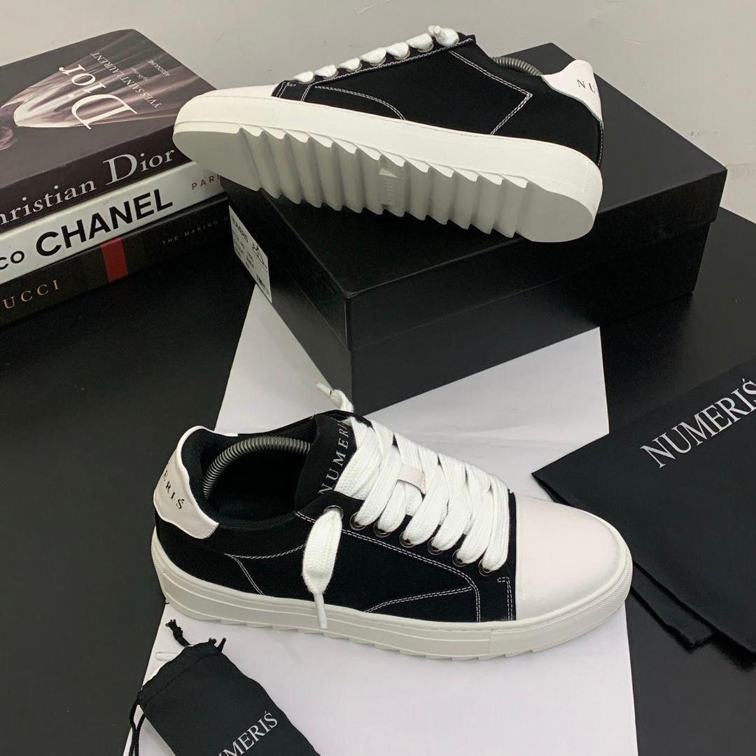 The Numeris Canvas Low offers a refined take on the classic tennis shoe. Crafted with a heavy-duty black cotton canvas upper, the design is elevated by crisp white contrast stitching and a reinforced rubber toe cap.