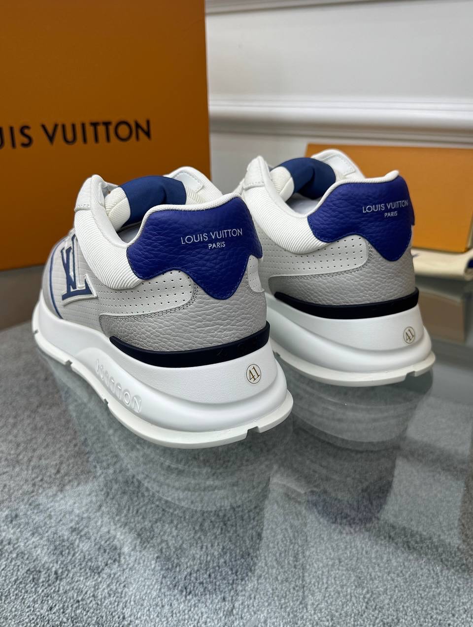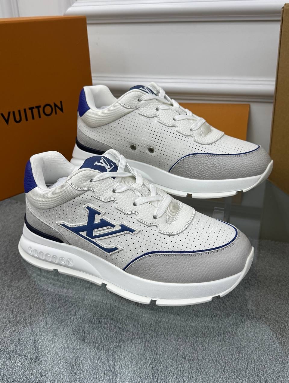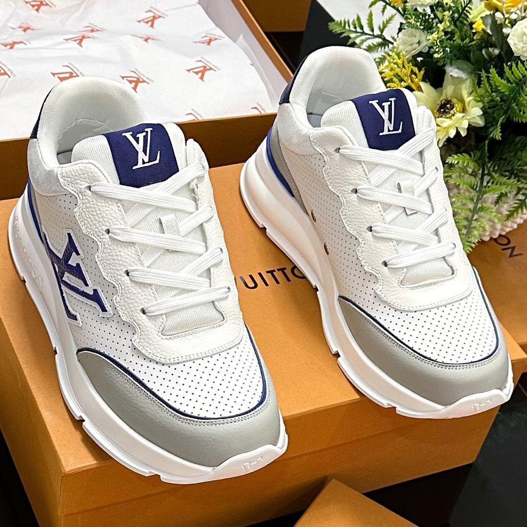 The clean white and grey color palette is sharply contrasted by deep navy blue accents on the tongue and the iconic LV Initial logo on the side. Every detail reflects LV's commitment to craftsmanship, from the branded eyelets to the oversized, sculptural rubber outsole that provides both an extra height boost and superior cushioning. Whether paired with high-end sportswear or casual denim, the Run 55 offers a bold, contemporary look that defines modern luxury footwear.