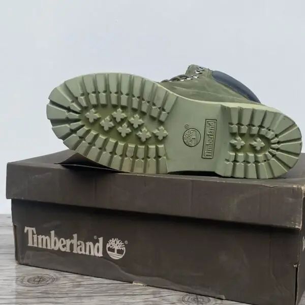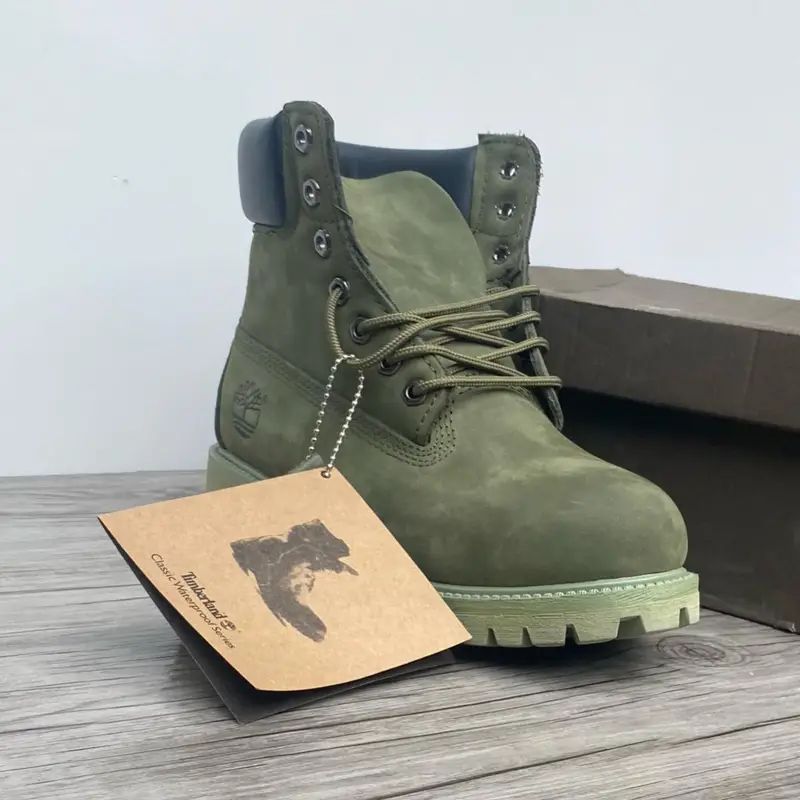 Discover the classic Timberland 6-Inch Premium Waterproof Boot in a stylish olive green. Featuring a durable nubuck leather upper, a padded collar, and a signature rubber lug sole, these boots are built for timeless style and all-weather performance
