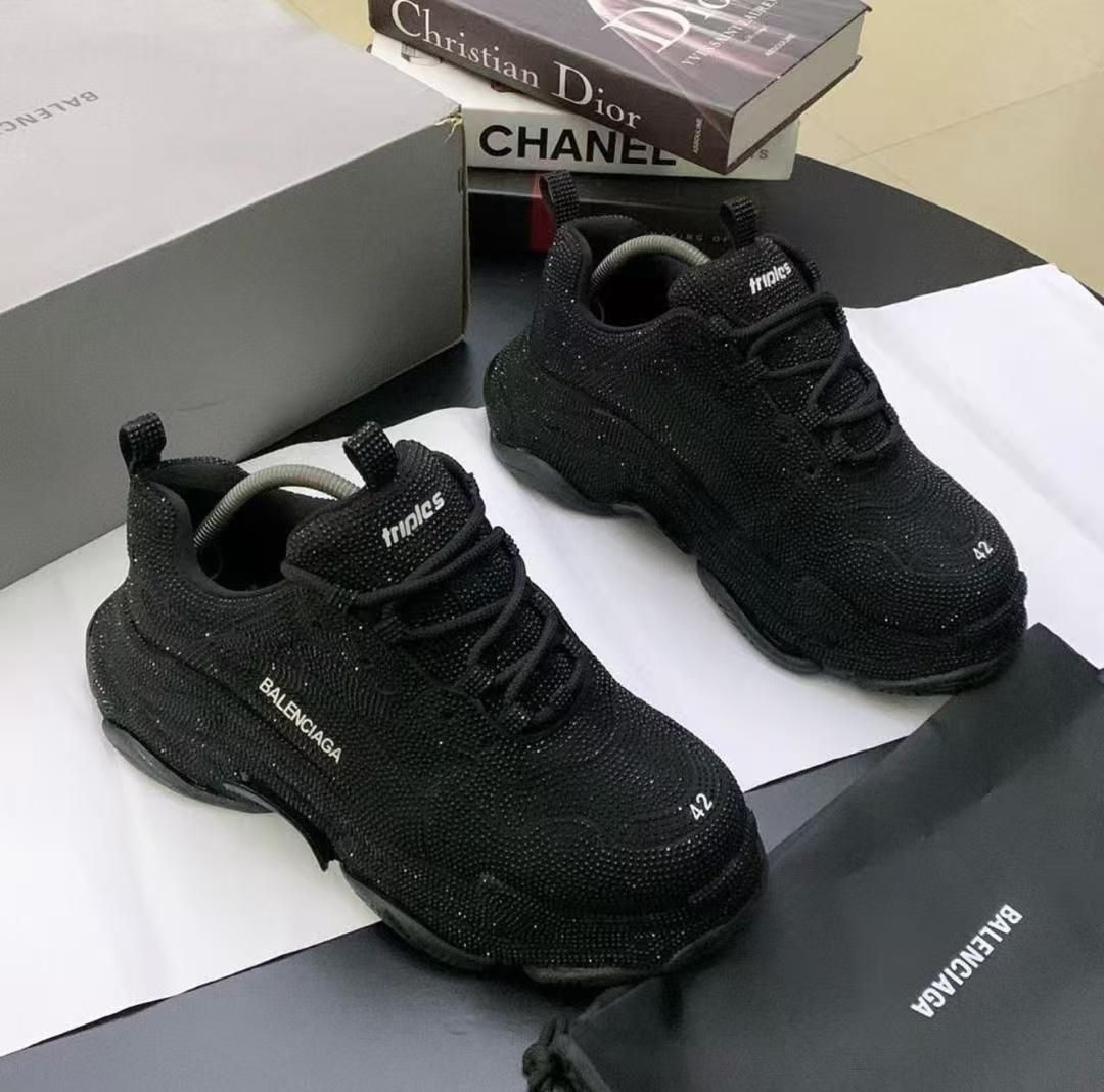 Step into glamour with the Balenciaga Runner Sneaker. These stunning shoes are covered in shimmering black crystals, combining a bold athletic silhouette with a dazzling, luxurious finish for the ultimate statement-making footwear.