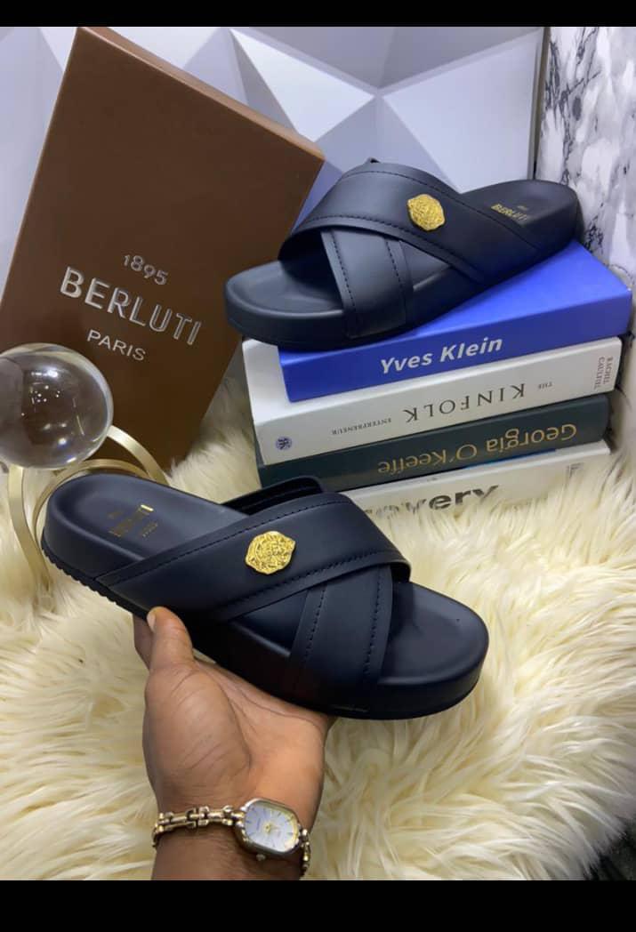 Redefine your luxury basics with these Berluti leather slides. Featuring a smooth black finish and a polished gold-tone Interlocking emblem, these sandals offer a sophisticated blend of comfort and high-fashion heritage.