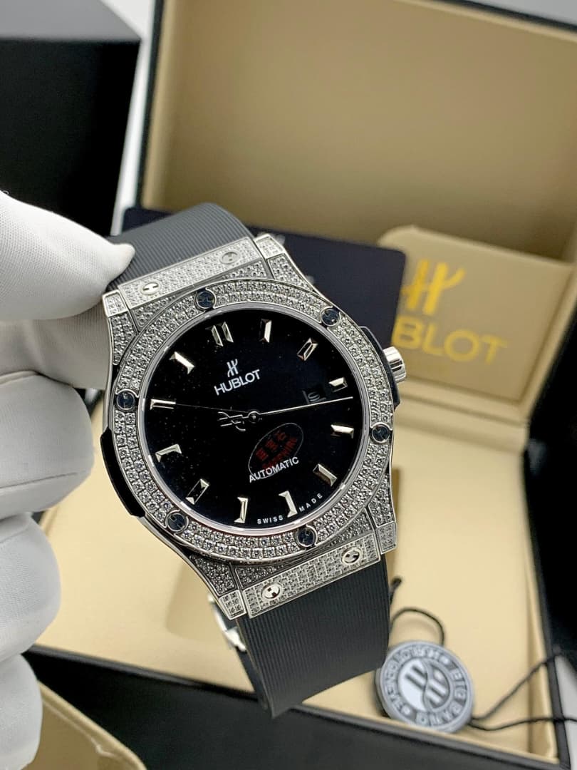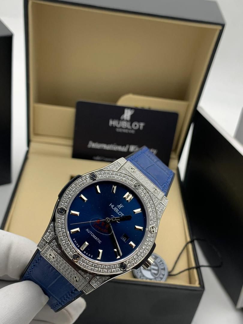 Elevate your style with this Hublot Classic Fusion, a masterpiece that balances luxury and modern design. The shimmering diamond-set bezel perfectly complements the deep sunray green dial, creating a captivating play of light. Finished with a matching green alligator strap for ultimate comfort and sophistication, this watch is a statement of refined taste and bold individuality.