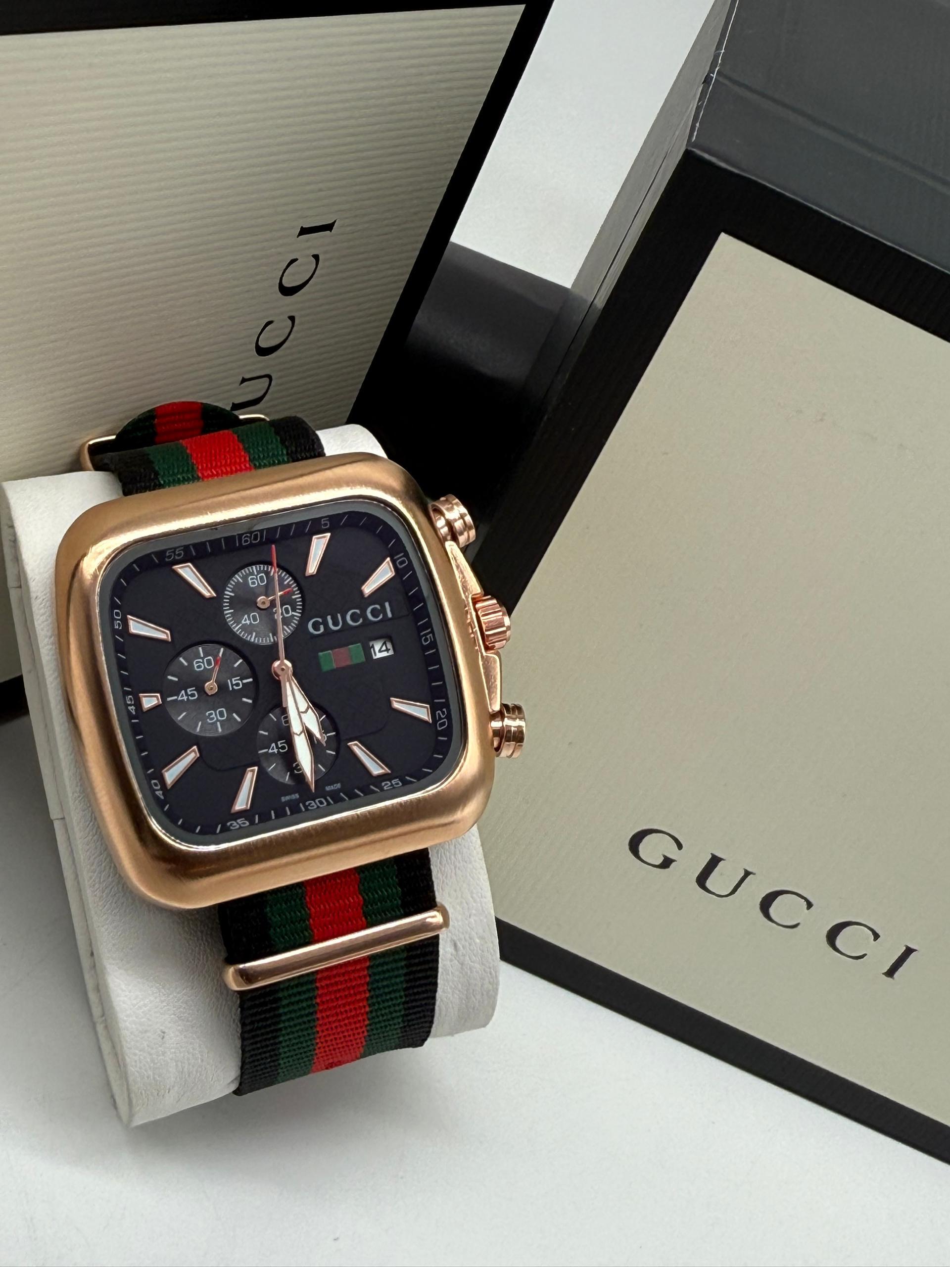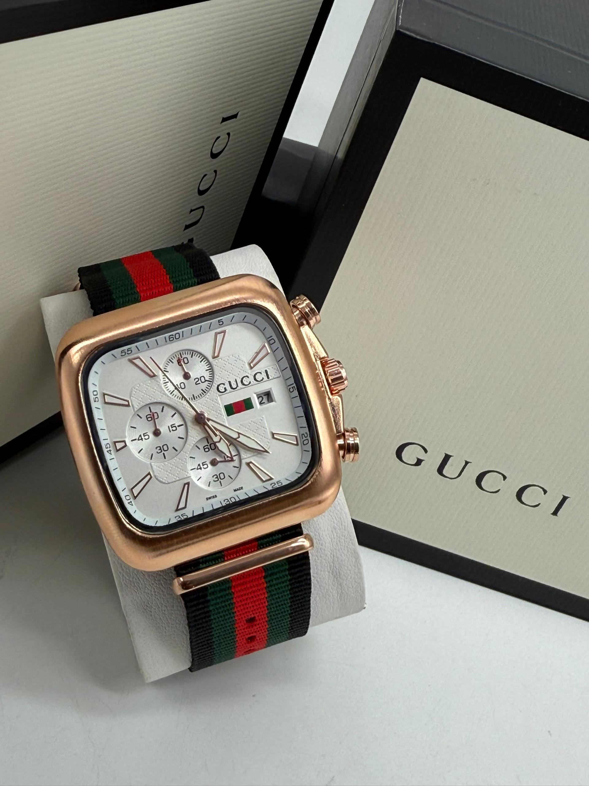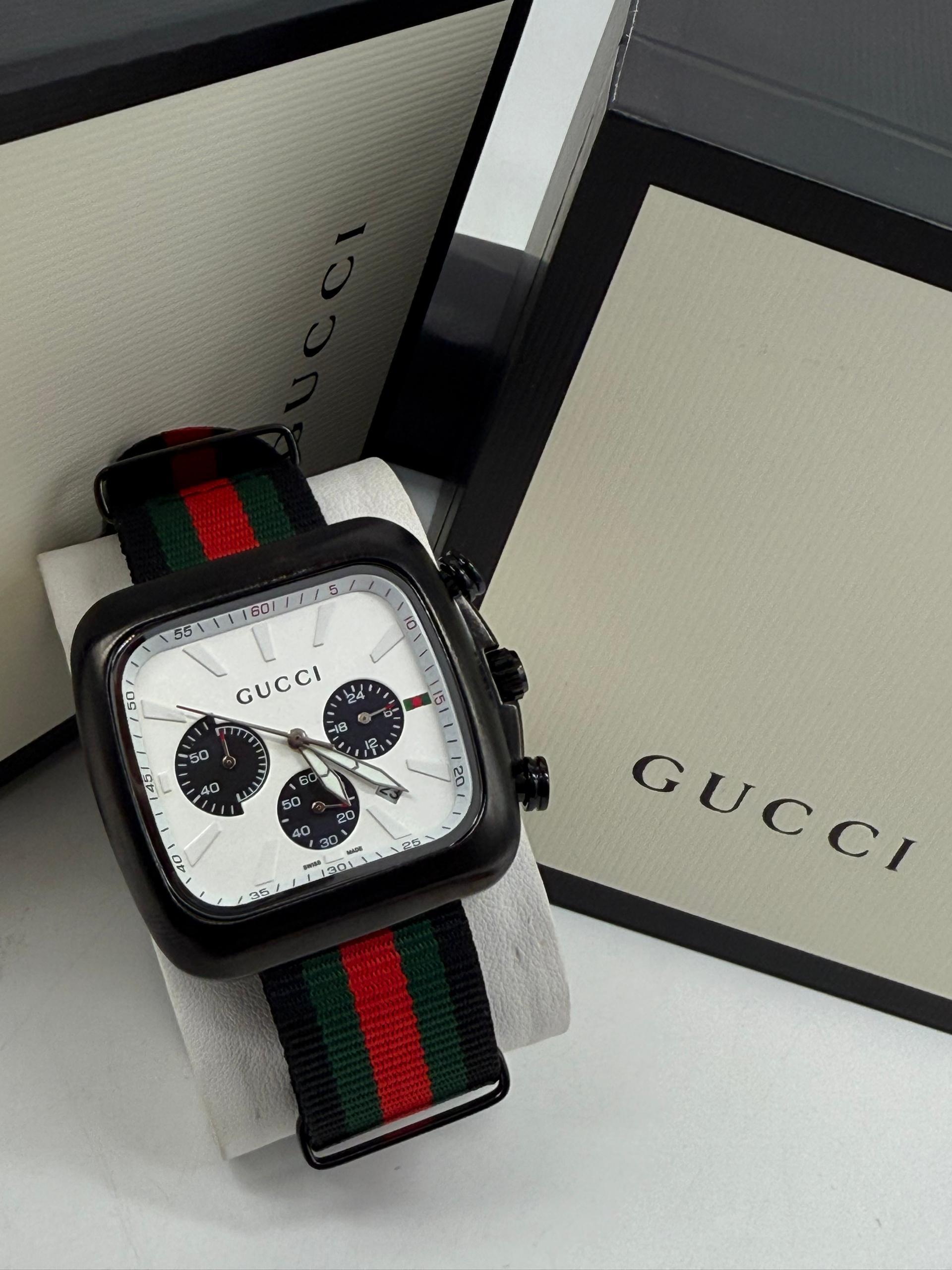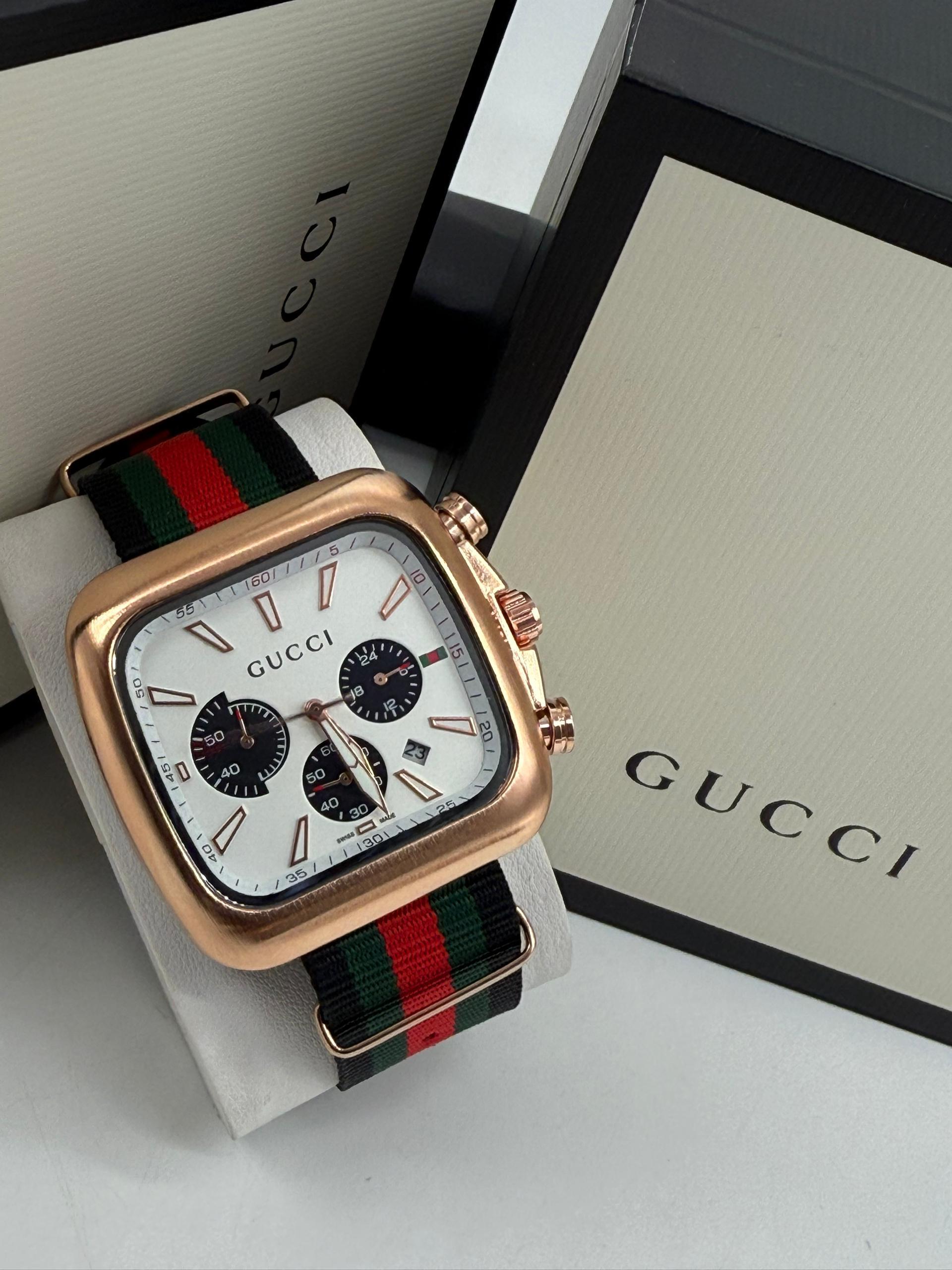 Iconic Color Scheme: The watch features the classic green and red striped nylon strap, a hallmark of the Gucci brand, adding a vibrant and luxurious touch.