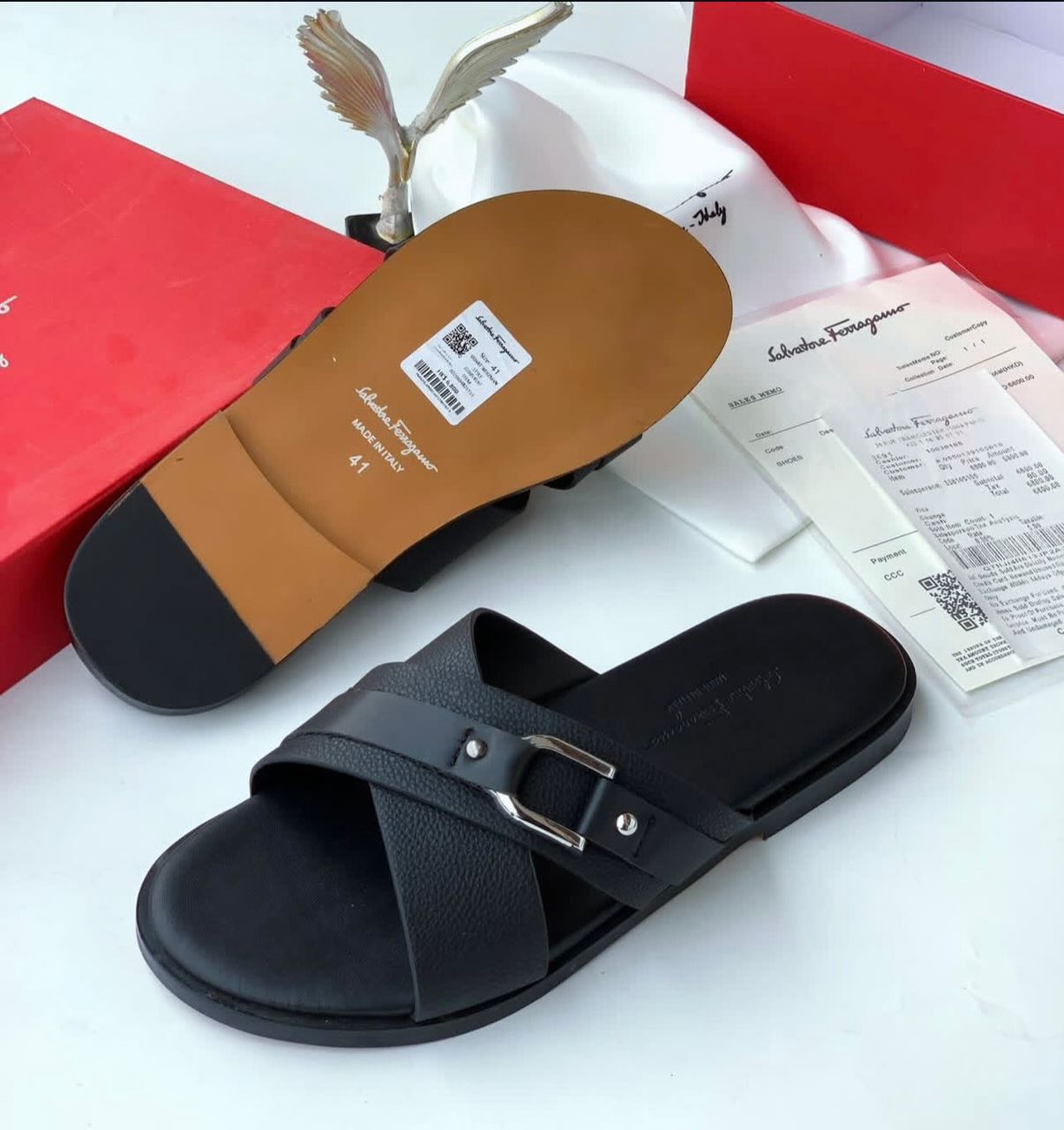 Elevate your summer wardrobe with these Italian-made crossover sandals from Ferragamo. Combining textured pebbled leather with smooth accents, the design is centered around the polished silver Gancini buckle—a hallmark of the brand's storied history in footwear.