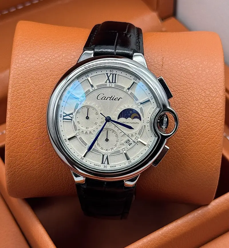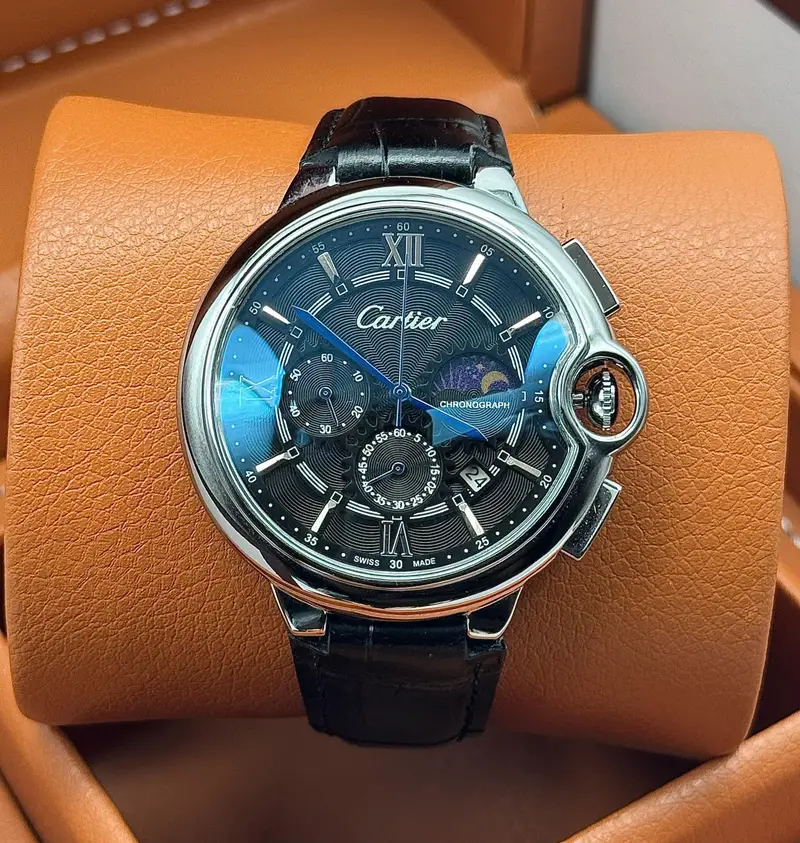 This Cartier timepiece is a sophisticated luxury watch with a blend of classical design and complex functionalities. It features a polished case, a black textured dial with Roman numerals, and a prominent, oversized winding crown. The watch combines two elegant complications—a chronograph and a moon phase display—making it a distinctive and highly functional dress watch
