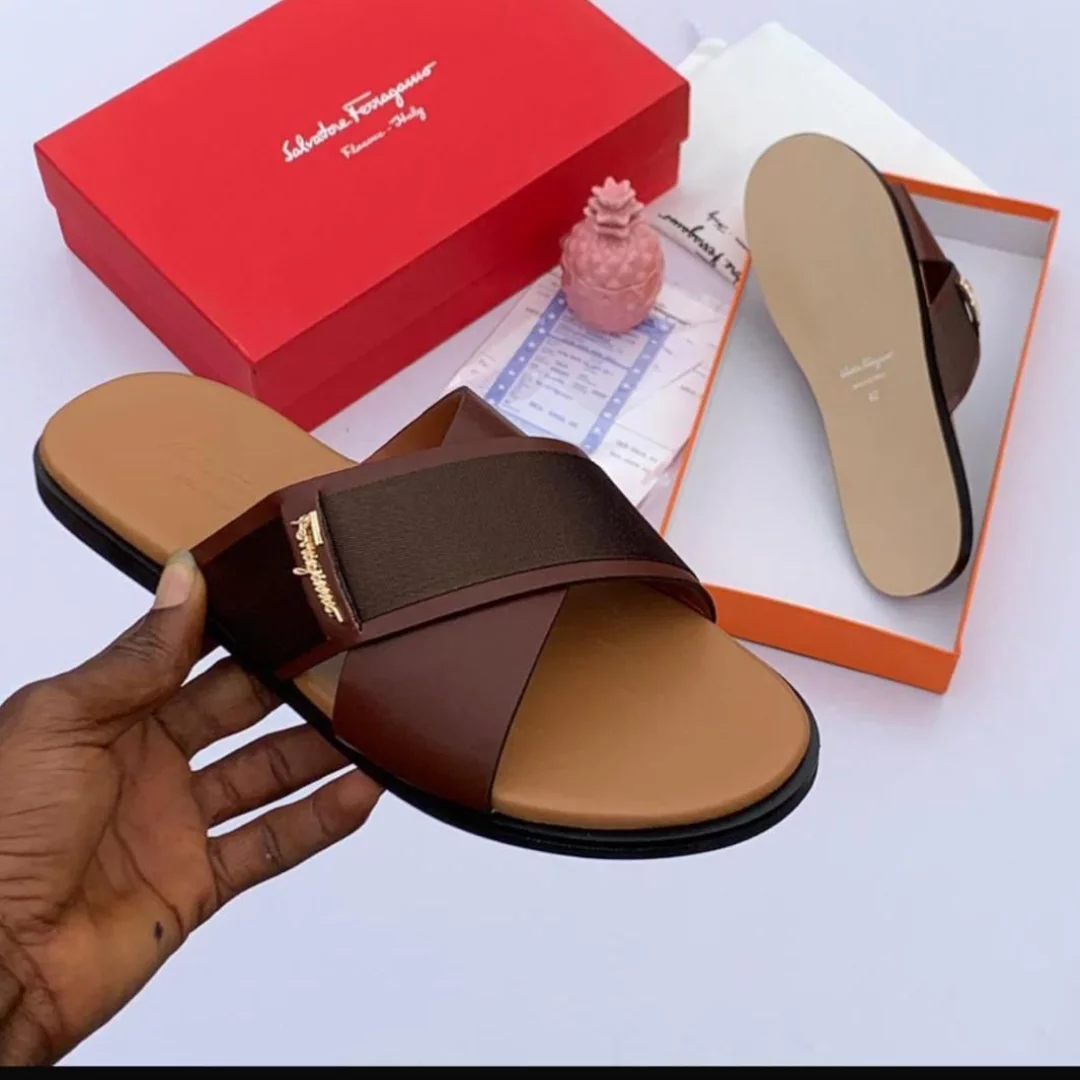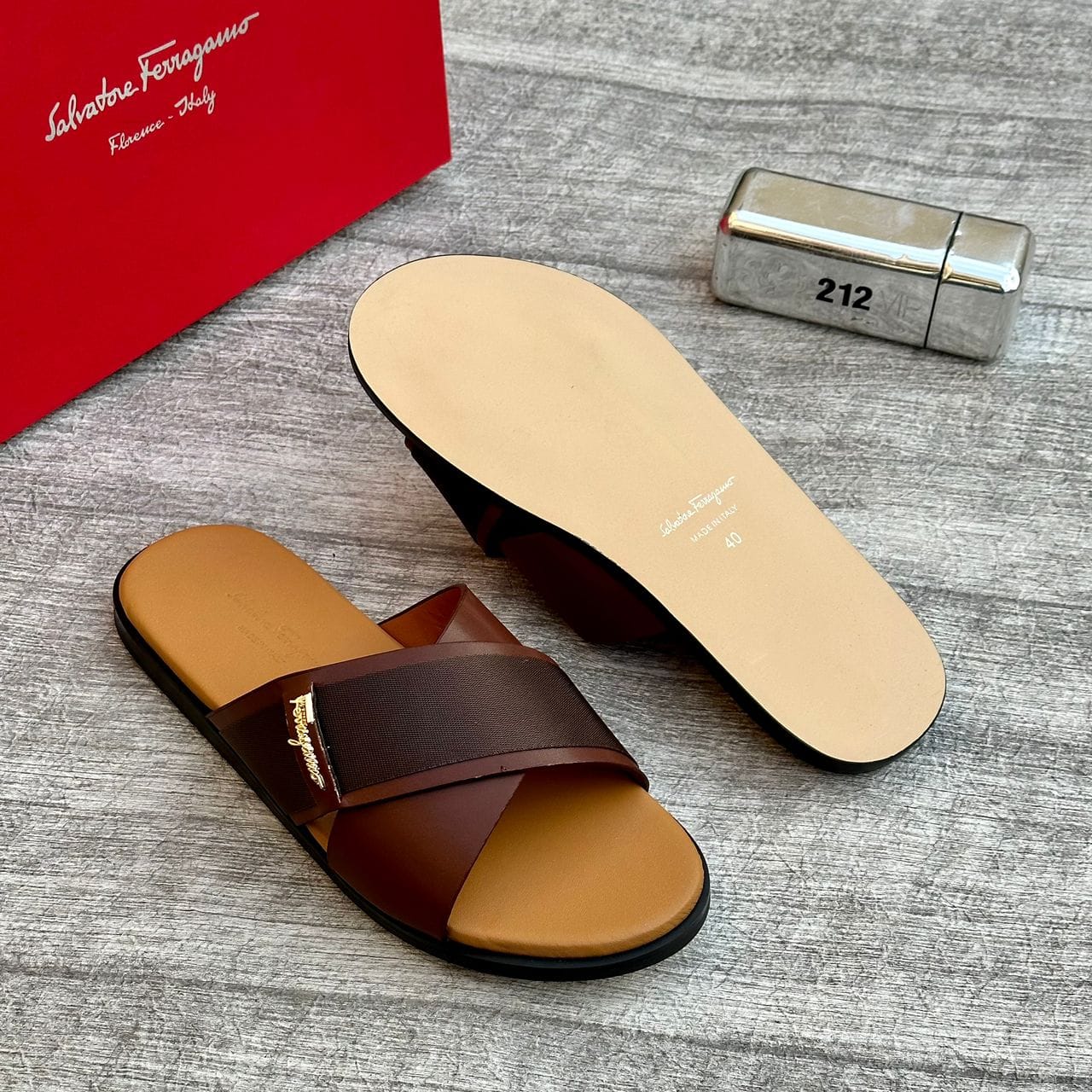 Elevate your off-duty style with these Italian-made Salvatore Ferragamo slides. Featuring a refined crisscross design in premium calfskin and textured fabric, these sandals offer a perfect blend of luxury and comfort. Finished with a discreet gold-tone logo tab and a durable rubber sole, they are the ultimate essential for the modern gentleman’s summer wardrobe.
