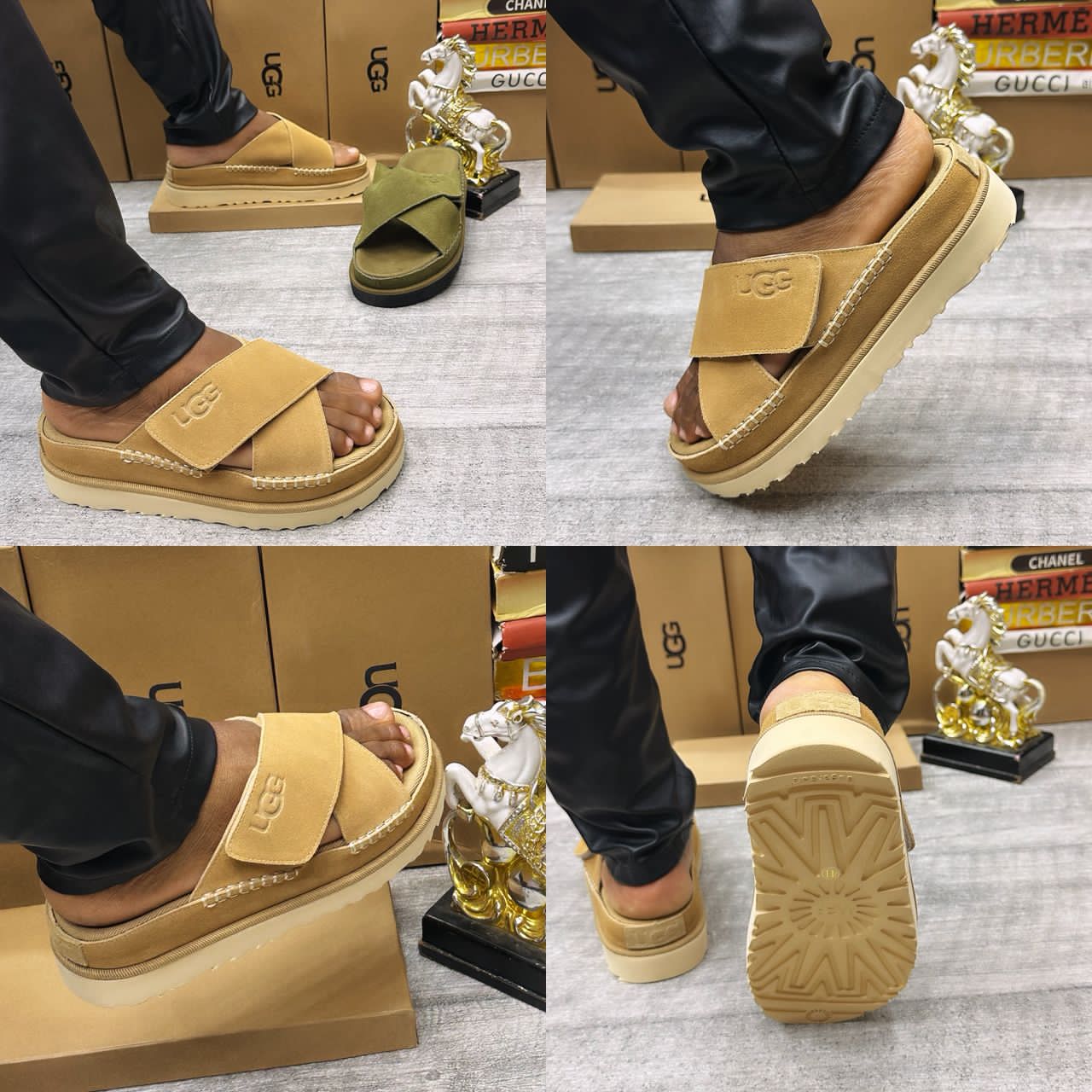 Step into elevated comfort. These UGG Golden Coast slides redefine casual luxury with a bold, cross-strap suede upper and a chunky platform sole. Featuring signature whipstitch detailing and an adjustable fit, they offer a modern, streetwear-ready look that transitions effortlessly from the poolside to the city streets
